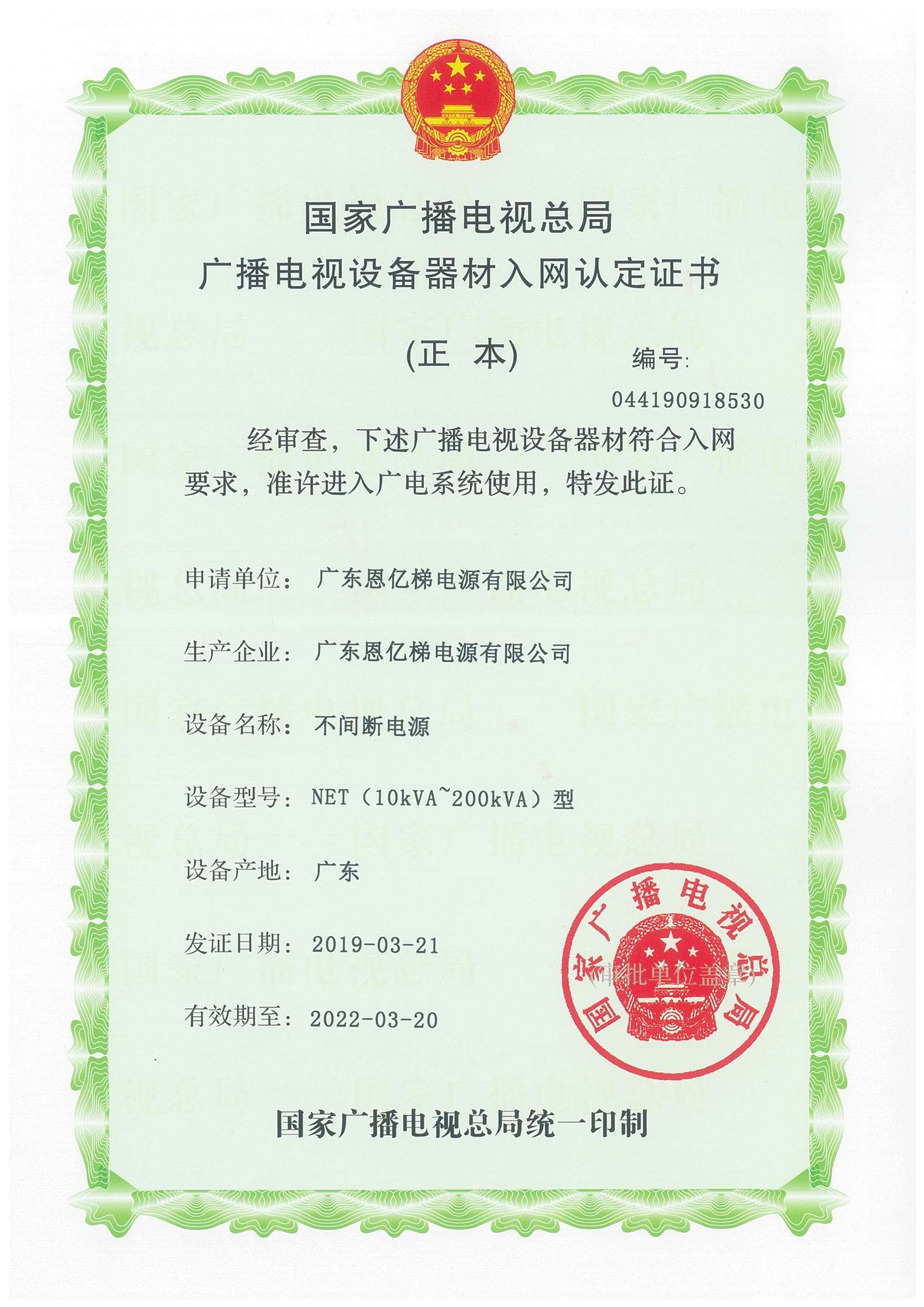 國家廣播電影電視總局入網(wǎng)認定證書(交流穩(wěn)壓電源)