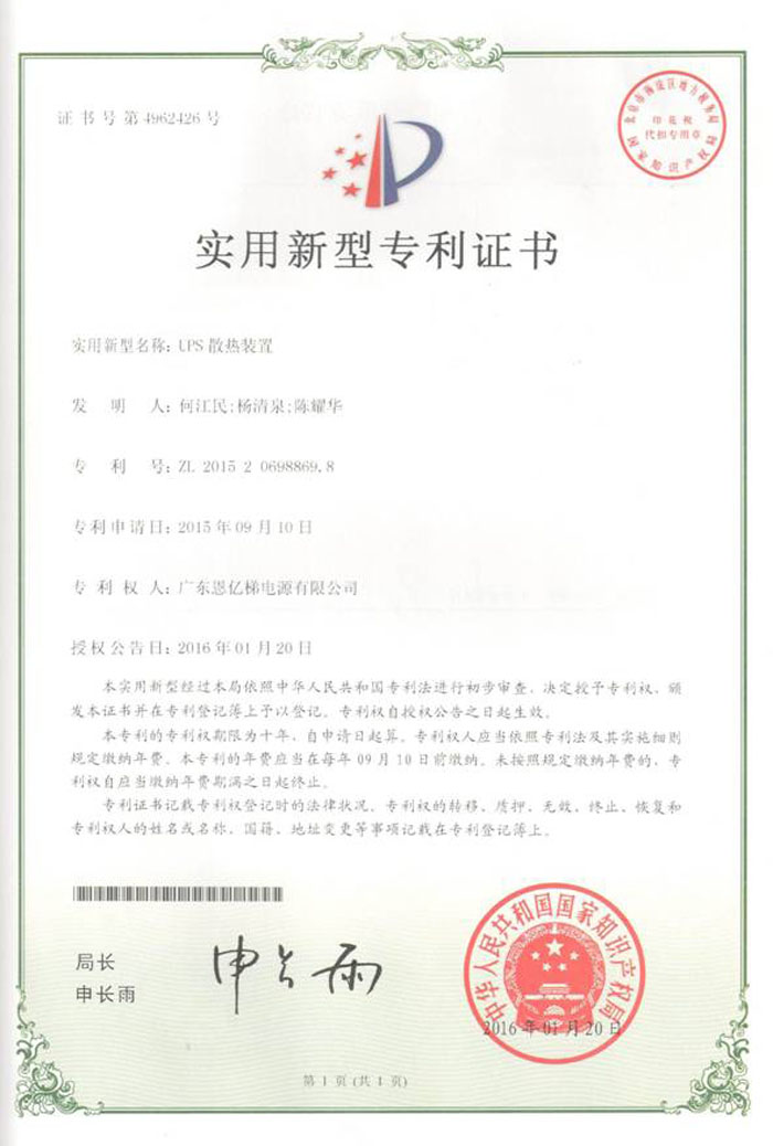 專利證書(shū)(UPS散熱裝置)