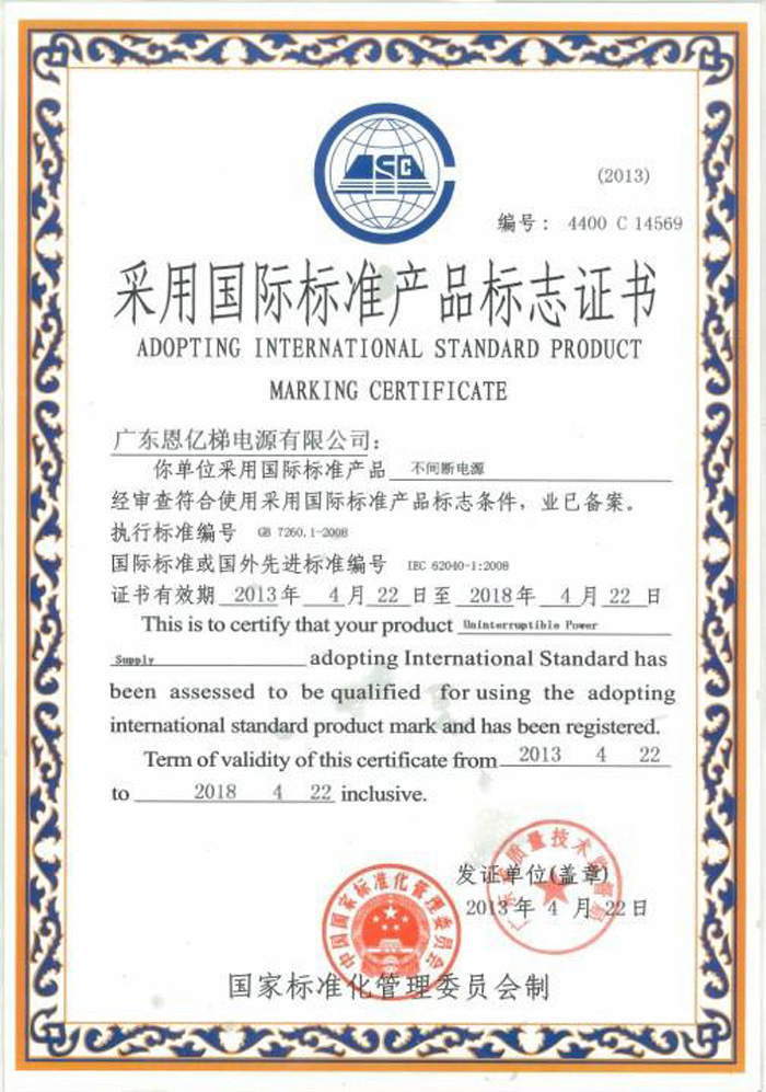 采用國際標準產品標志證書